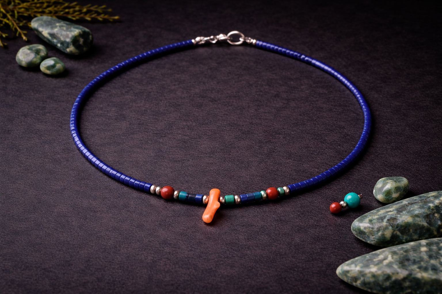 Ce bracelet délicat réunit de minuscules perles de lapis lazuli bleu nuit intense (2-3 mm) pour un effet raffiné et aérien au poignet féminin. Une pierre centrale en corail rouge vibrant vient illuminer l’ensemble, symbolisant en lithothérapie la sagesse intuitive du lapis et l’énergie revitalisante du corail pour un bijou élégant et protecteur au quotidien.