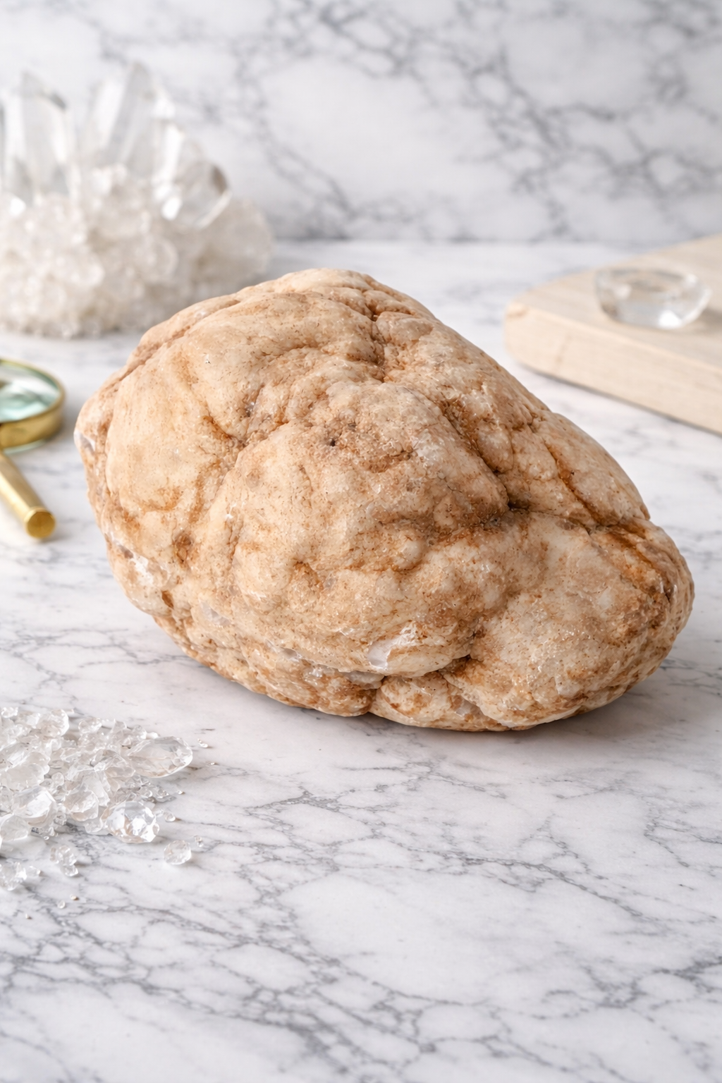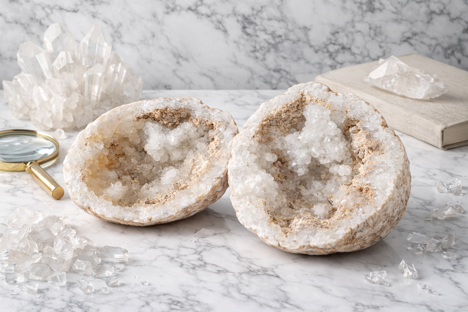 Géode de cristal de roche pouvant s’ouvrir et se refermer, révélant des cristaux scintillants à l’intérieur. Objet à la fois décoratif et énergétique.