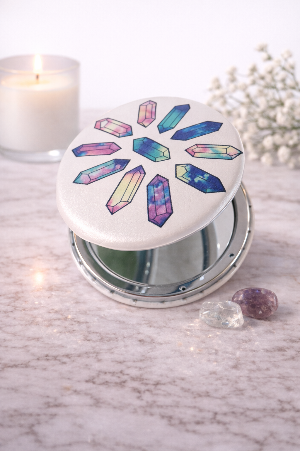 Ce miroir de poche est à la fois pratique et élégant. Son motif coloré apporte une touche originale et délicate, tandis que son format compact permet de l’emporter facilement partout.
