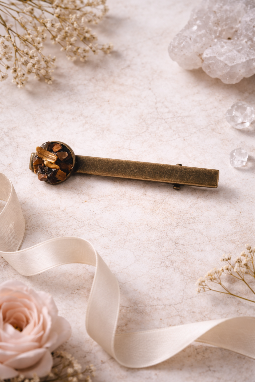 Barrette type pince ornée d’œil de tigre, pierre aux reflets dorés et bruns, symbole de protection et de force.